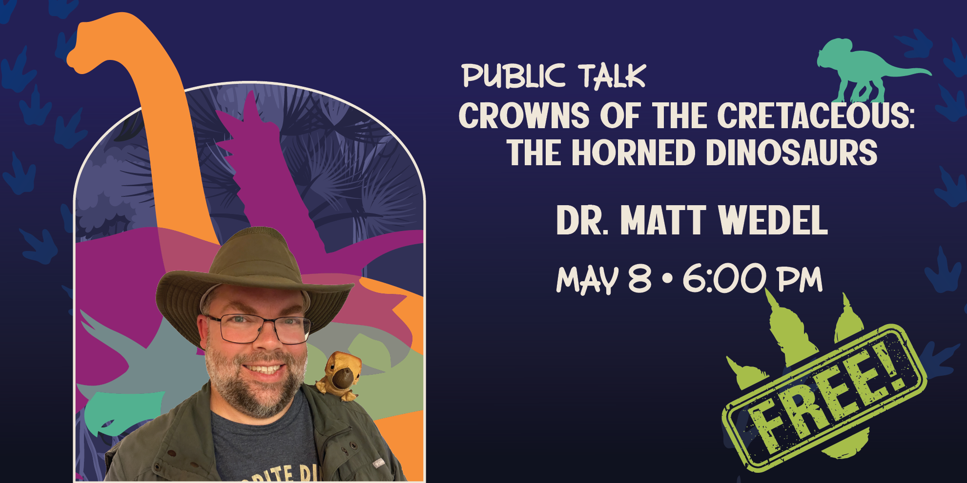 A leading sauropod specialist and co‑author of several landmark dinosaur discoveries, Wedel will discuss the origins and evolution of horned ceratopsian dinosaurs, including the famous Triceratops as well as the breakout star Aquilops americanus — the earliest known ceratopsian dinosaur in North America and most recently cast as “Dolores,” the pet‑like backpack dinosaur in Jurassic World: Rebirth. The program will also highlight the museum’s world‑famous Pentaceratops skull, the largest skull of any land animal ever discovered.