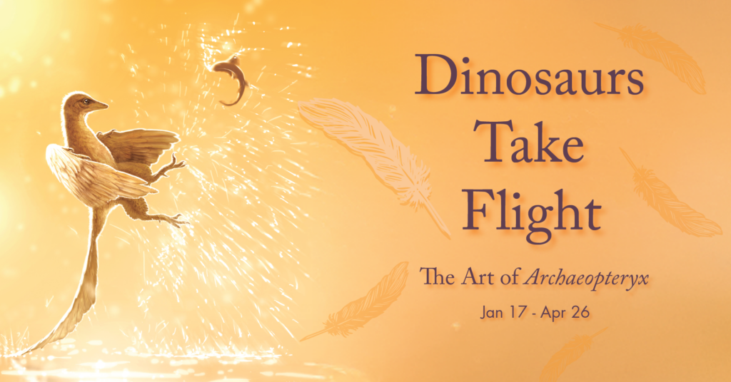 Dinosaurs are taken to new heights in this elegant traveling exhibition—engaging visitors at the intersection of art, science, and history. Archaeopteryx provides a critical bridge between dinosaurs and birds. Starting with the initial discovery in 1861, Archaeopteryx has been an integral part of the discussion of evolution, the origin of birds, and the origin of flight. Scientists from across the globe have conducted extensive research to better understand this “missing link,” and studies continue still.